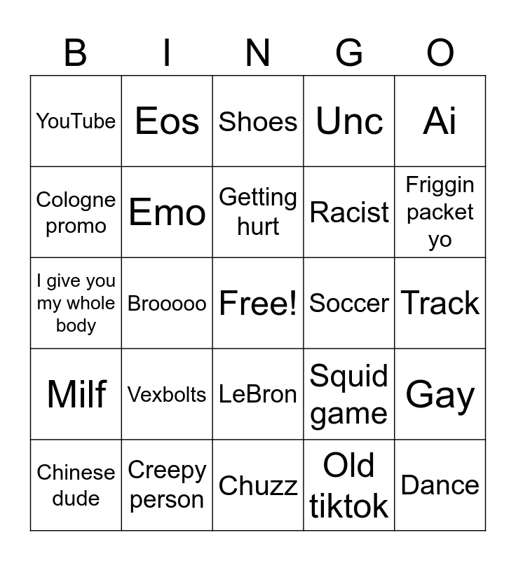 This bingo card has a free space and 24 words: Vexbolts, Creepy person, Getting hurt, Chinese dude, Ai, YouTube, Cologne promo, Eos, Soccer, LeBron, Racist, I give you my whole body, Squid game, Gay, Emo, Old tiktok, Track, Shoes, Friggin packet yo, Brooooo, Dance, Milf, Unc and Chuzz.