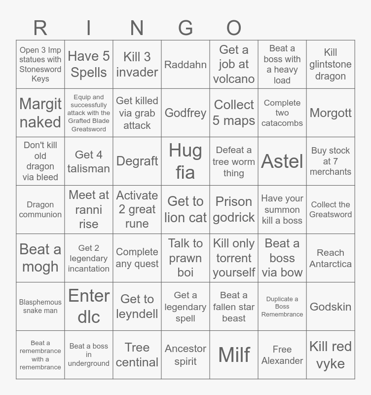 This bingo card has 49 words: Duplicate a Boss Remembrance, Complete two catacombs, Milf, Meet at ranni rise, Degraft, Collect the Greatsword, Have 5 Spells, Tree centinal, Beat a boss with a heavy load, Talk to prawn boi, Kill glintstone dragon, Raddahn, Astel, Defeat a tree worm thing, Enter dlc, Have your summon kill a boss, Margit naked, Morgott, Godskin, Get a job at volcano, Collect 5 maps, Activate 2 great rune, Open 3 Imp statues with Stonesword Keys, Equip and successfully attack with the Grafted Blade Greatsword, Beat a remembrance with a remembrance, Get killed via grab attack, Buy stock at 7 merchants, Beat a boss in underground, Hug fia, Get 4 talisman, Kill red vyke, Prison godrick, Blasphemous snake man, Get to leyndell, Dragon communion, Kill only torrent yourself, Beat a boss via bow, Reach Antarctica, Don't kill old dragon via bleed, Complete any quest, Get a legendary spell, Beat a mogh, Get to lion cat, Ancestor spirit, Godfrey, Kill 3 invader, Beat a fallen star beast, Get 2 legendary incantation and Free Alexander.
