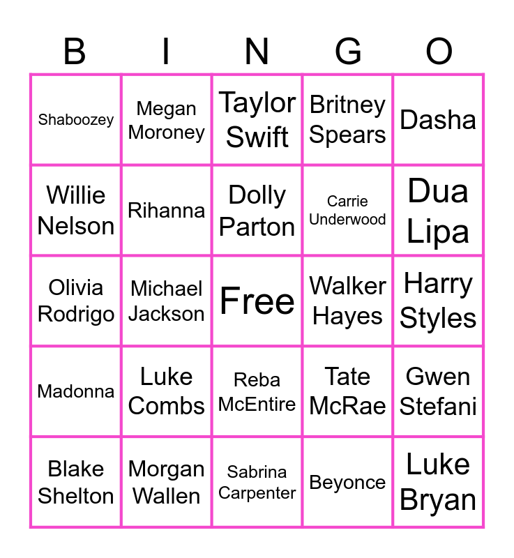 This bingo card has a free space and 24 words: Luke Combs, Morgan Wallen, Dolly Parton, Blake Shelton, Dasha, Shaboozey, Willie Nelson, Megan Moroney, Walker Hayes, Reba McEntire, Carrie Underwood, Olivia Rodrigo, Tate McRae, Gwen Stefani, Rihanna, Beyonce, Harry Styles, Taylor Swift, Dua Lipa, Michael Jackson, Luke Bryan, Madonna, Britney Spears and Sabrina Carpenter.