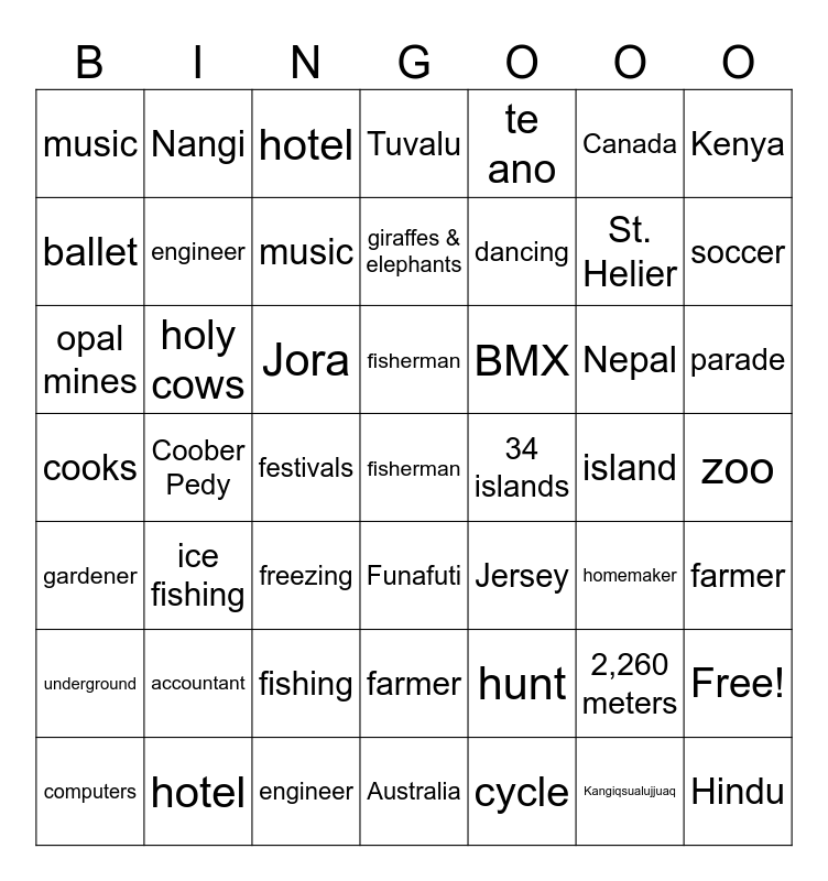 This bingo card has 50 words: Free!, St. Helier, Kangiqsualujjuaq, Coober Pedy, Jora, Funafuti, Nangi, Australia, Canada, Jersey, Kenya, Tuvalu, Nepal, BMX, fishing, zoo, ballet, soccer, computers, te ano, dancing, festivals, music, engineer, hotel, fisherman, music, engineer, hotel, fisherman, homemaker, gardener, accountant, farmer, cooks, island, homemaker, farmer, underground, opal mines, freezing, hunt, ice fishing, cycle, parade, giraffes & elephants, 34 islands, 2,260 meters, holy cows and Hindu.