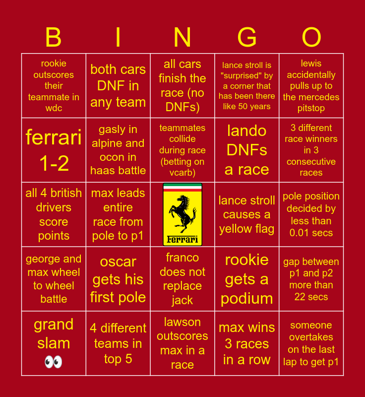 This bingo card has a free space and 24 words: oscar gets his first pole, 4 different teams in top 5, teammates collide during race (betting on vcarb), grand slam 👀, lewis accidentally pulls up to the mercedes pitstop, rookie outscores their teammate in wdc, ferrari 1-2, both cars DNF in any team, lance stroll causes a yellow flag, franco does not replace jack, lando DNFs a race, all 4 british drivers score points, rookie gets a podium, gap between p1 and p2 more than 22 secs, gasly in alpine and ocon in haas battle, max wins 3 races in a row, pole position decided by less than 0.01 secs, all cars finish the race (no DNFs), 3 different race winners in 3 consecutive races, max leads entire race from pole to p1, someone overtakes on the last lap to get p1, george and max wheel to wheel battle, lance stroll is "surprised" by a corner that has been there like 50 years and lawson outscores max in a race.