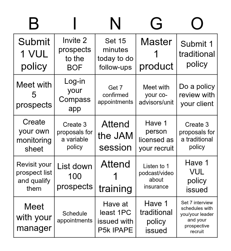 This bingo card has a free space and 24 words: List down 100 prospects, Schedule appointments, Get 7 confirmed appointments, Meet with your manager, Submit 1 traditional policy, Submit 1 VUL policy, Meet with 5 prospects, Invite 2 prospects to the BOF, Have 1 person licensed as your recruit, Attend 1 training, Meet with your co-advisors/unit, Create your own monitoring sheet, Listen to 1 podcast/video about insurance, Have 1 VUL policy issued, Log-in your Compass app, Have 1 traditional policy issued, Create 3 proposals for a traditional policy, Set 15 minutes today to do follow-ups, Do a policy review with your client, Create 3 proposals for a variable policy, Set 7 interview schedules with you/your leader and your prospective recruit, Revisit your prospect list and qualify them, Master 1 product and Have at least 1PC issued with P5k IPAPE.
