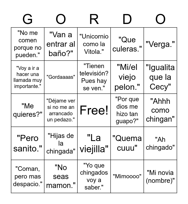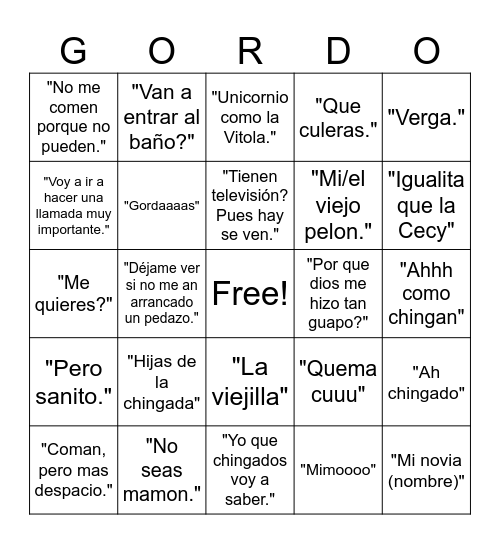 This bingo card has a free space and 24 words: "Hijas de la chingada", "No seas mamon.", "Tienen televisión? Pues hay se ven.", "Coman, pero mas despacio.", "Verga.", "No me comen porque no pueden.", "Voy a ir a hacer una llamada muy importante.", "Van a entrar al baño?", "Por que dios me hizo tan guapo?", "La viejilla", "Mi/el viejo pelon.", "Me quieres?", "Quema cuuu", "Ah chingado", "Gordaaaas", "Mimoooo", "Ahhh como chingan", "Unicornio como la Vitola.", "Igualita que la Cecy", "Déjame ver si no me an arrancado un pedazo.", "Mi novia (nombre)", "Pero sanito.", "Que culeras." and "Yo que chingados voy a saber.".