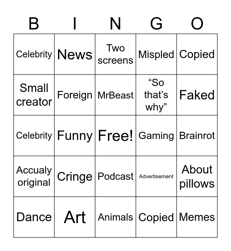This bingo card has a free space and 24 words: Cringe, Art, MrBeast, Dance, Copied, Celebrity, Small creator, News, Gaming, Podcast, “So that’s why”, Celebrity, Advertisement, About pillows, Foreign, Copied, Brainrot, Two screens, Faked, Funny, Memes, Accualy original, Mispled and Animals.