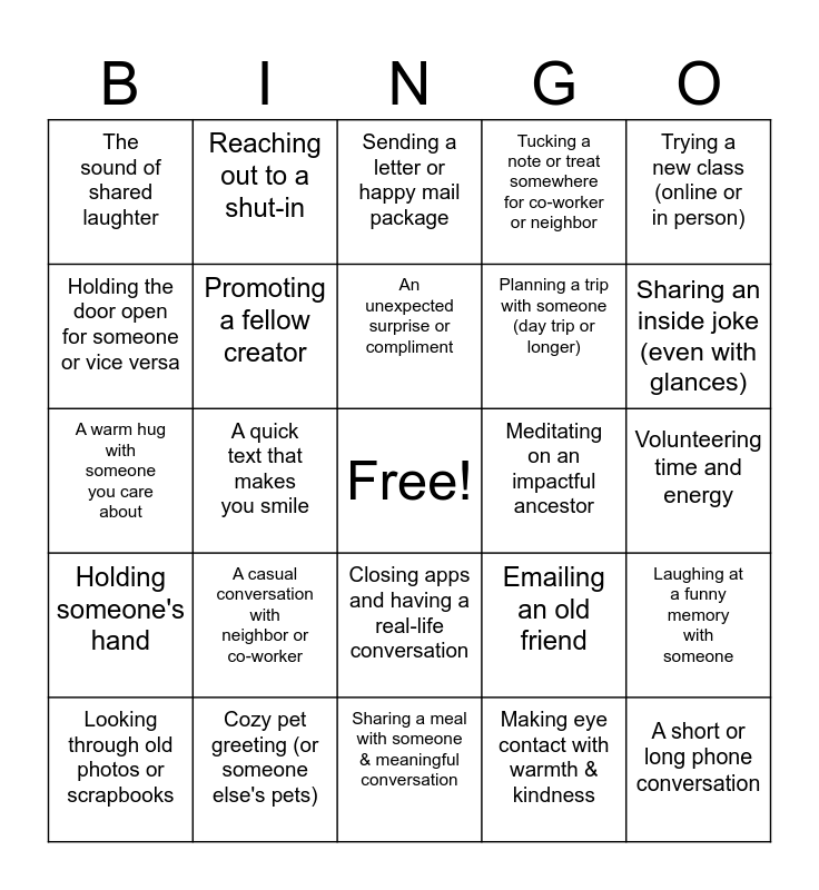 This bingo card has a free space and 24 words: A casual conversation with neighbor or co-worker, Cozy pet greeting (or someone else's pets), An unexpected surprise or compliment, Looking through old photos or scrapbooks, Trying a new class (online or in person), The sound of shared laughter, Holding the door open for someone or vice versa, Reaching out to a shut-in, Meditating on an impactful ancestor, Closing apps and having a real-life conversation, Planning a trip with someone (day trip or longer), A warm hug with someone you care about, Emailing an old friend, Laughing at a funny memory with someone, Promoting a fellow creator, Making eye contact with warmth & kindness, Volunteering time and energy, Sending a letter or happy mail package, Sharing an inside joke (even with glances), A quick text that makes you smile, A short or long phone conversation, Holding someone's hand, Tucking a note or treat somewhere for co-worker or neighbor and Sharing a meal with someone & meaningful conversation.