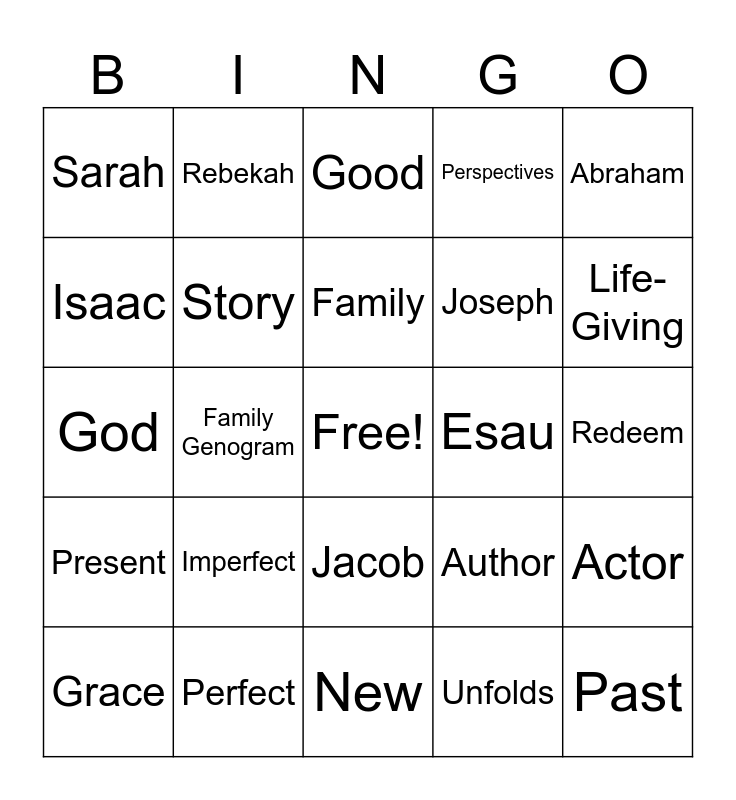 This bingo card has a free space and 24 words: Imperfect, Perfect, Family, Grace, Abraham, Sarah, Isaac, Rebekah, Esau, Jacob, Joseph, God, Author, Actor, Story, Unfolds, Redeem, Good, Life-Giving, Family Genogram, Past, Present, Perspectives and New.