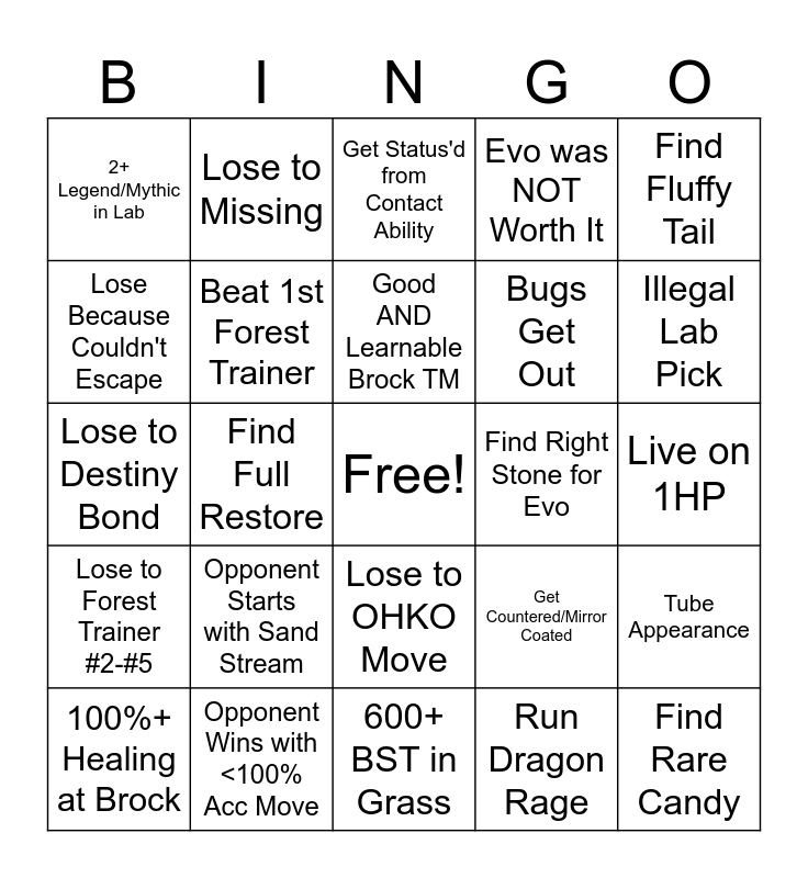 This bingo card has a free space and 57 words: 10+ Viewer Raid, 100%+ Healing at Brock, 1st Forest Trainer has Legend/Mythic, 2+ Legend/Mythic in Lab, 600+ BST in Grass, All Baby Lab, Beat 1st Forest Trainer, Brock has Legend/Mythic, Bugs Get Out, Catch Rated, Evo was NOT Worth It, Evo was Worth It, Favorite in Lab, Fight Ourselves, Fight Trainer Named "BINGO!", Find DeepSea Item, Find Fluffy Tail, Find Full Restore, Find Master/Nest Ball, Find Rare Candy, Find Right Stone for Evo, Frozen/Para'd/Sleep for 3+ Turns in a Row, Get Countered/Mirror Coated, Get Status'd from Contact Ability, Get Status'd from Non-Status Move, Good AND Learnable Brock TM, Gym Leader TM in Lab, Have to Poison Dance, Illegal Lab Pick, Illegal Level-Up Move, Lab Pick/Pivot has Huge/Pure Power, Lab Pick/Pivot has Truant, Lab Pick/Pivot is a MANS, Level-Up Move Makes Luce Pog, Live on 1HP, Lose Because Couldn't Escape, Lose to Brock's Gym Trainer, Lose to Destiny Bond, Lose to Dragon Rage, Lose to Forest Trainer #2-#5, Lose to Missing, Lose to OHKO Move, Lose to Perish Song, Luce Correctly Guesses Item, Mon in Grass uses Self-KO Move, Opponent has Truant, Opponent Starts with Sand Stream, Opponent Wins with <100% Acc Move, Past Kaizo Winner in Lab/Grass, Pig Mon Appearance, Piglet Guesses Level-Up Move/TM, Run Dragon Rage, Running it Straight from the Lab, Same Pivot in Multiple Routes, Surskit Appearance (Ah!), Tube Appearance and We Land OHKO Move.