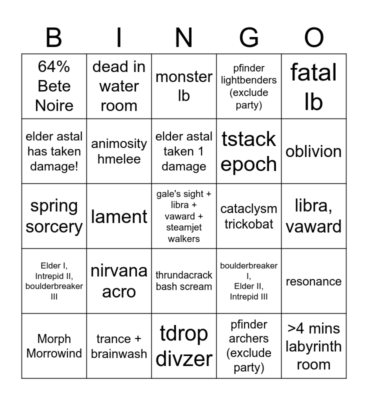 This bingo card has a free space and 24 words: nirvana acro, trance + brainwash, elder astal taken 1 damage, Morph Morrowind, fatal lb, 64% Bete Noire, elder astal has taken damage!, dead in water room, cataclysm trickobat, thrundacrack bash scream, tstack epoch, spring sorcery, boulderbreaker I, Elder II, Intrepid III, resonance, animosity hmelee, pfinder archers (exclude party), libra, vaward, monster lb, oblivion, lament, >4 mins labyrinth room, Elder I, Intrepid II, boulderbreaker III, pfinder lightbenders (exclude party) and tdrop divzer.