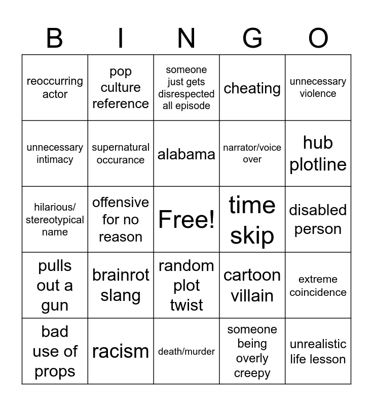 This bingo card has a free space and 24 words: brainrot slang, racism, alabama, bad use of props, unnecessary violence, reoccurring actor, unnecessary intimacy, pop culture reference, time skip, random plot twist, narrator/voice over, hilarious/ stereotypical name, cartoon villain, extreme coincidence, supernatural occurance, someone being overly creepy, disabled person, someone just gets disrespected all episode, hub plotline, offensive for no reason, unrealistic life lesson, pulls out a gun, cheating and death/murder.