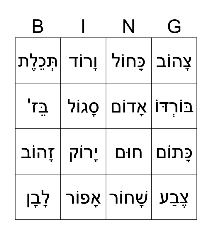 This bingo card has 17 words: שָׁחוֹר, לָבָן, כָּחוֹל, תְּכֵלֶת, יָרוֹק, צָהוֹב, כָּתוֹם, אָדוֹם, בּוֹרְדּוֹ, סָגוֹל, אָפוֹר, חוּם, 'בֵּז, וָרוֹד, זָהוֹב, צְבָעִים and צֶבַע.