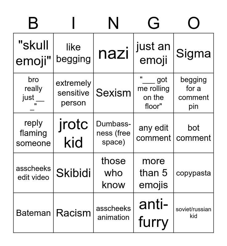 This bingo card has a free space and 24 words: Skibidi, Racism, Sexism, Bateman, Sigma, "skull emoji", bro really just ___", like begging, any edit comment, those who know, "___ got me rolling on the floor", reply flaming someone, more than 5 emojis, copypasta, extremely sensitive person, anti-furry, bot comment, nazi, begging for a comment pin, jrotc kid, soviet/russian kid, asscheeks edit video, just an emoji and asscheeks animation.