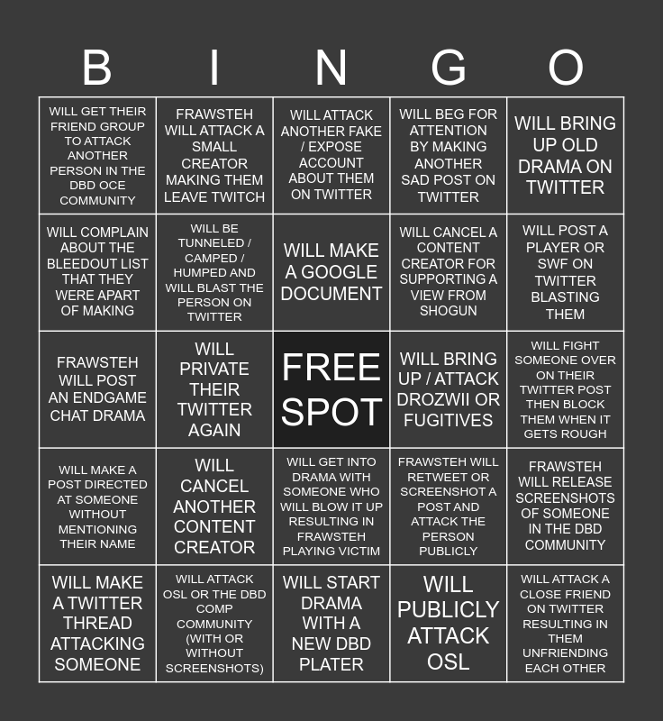 This bingo card has a free space and 24 words: WILL CANCEL ANOTHER CONTENT CREATOR, WILL ATTACK OSL OR THE DBD COMP COMMUNITY (WITH OR WITHOUT SCREENSHOTS), WILL MAKE A GOOGLE DOCUMENT, WILL MAKE A TWITTER THREAD ATTACKING SOMEONE, WILL BRING UP OLD DRAMA ON TWITTER, WILL GET THEIR FRIEND GROUP TO ATTACK ANOTHER PERSON IN THE DBD OCE COMMUNITY, WILL COMPLAIN ABOUT THE BLEEDOUT LIST THAT THEY WERE APART OF MAKING, FRAWSTEH WILL ATTACK A SMALL CREATOR MAKING THEM LEAVE TWITCH, WILL BRING UP / ATTACK DROZWII OR FUGITIVES, WILL GET INTO DRAMA WITH SOMEONE WHO WILL BLOW IT UP RESULTING IN FRAWSTEH PLAYING VICTIM, WILL CANCEL A CONTENT CREATOR FOR SUPPORTING A VIEW FROM SHOGUN, FRAWSTEH WILL POST AN ENDGAME CHAT DRAMA, FRAWSTEH WILL RETWEET OR SCREENSHOT A POST AND ATTACK THE PERSON PUBLICLY, FRAWSTEH WILL RELEASE SCREENSHOTS OF SOMEONE IN THE DBD COMMUNITY, WILL BE TUNNELED / CAMPED / HUMPED AND WILL BLAST THE PERSON ON TWITTER, WILL PUBLICLY ATTACK OSL, WILL FIGHT SOMEONE OVER ON THEIR TWITTER POST THEN BLOCK THEM WHEN IT GETS ROUGH, WILL ATTACK ANOTHER FAKE / EXPOSE ACCOUNT ABOUT THEM ON TWITTER, WILL POST A PLAYER OR SWF ON TWITTER BLASTING THEM, WILL PRIVATE THEIR TWITTER AGAIN, WILL ATTACK A CLOSE FRIEND ON TWITTER RESULTING IN THEM UNFRIENDING EACH OTHER, WILL MAKE A POST DIRECTED AT SOMEONE WITHOUT MENTIONING THEIR NAME, WILL BEG FOR ATTENTION BY MAKING ANOTHER SAD POST ON TWITTER and WILL START DRAMA WITH A NEW DBD PLATER.