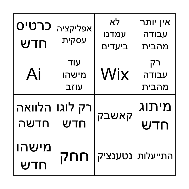 This bingo card has 16 words: חחק, מיתוג חדש, לא עמדנו ביעדים, כרטיס חדש, הלוואה חדשה, אפליקציה עסקית, קאשבק, נטענציק, Ai, עוד מישהו עוזב, מישהו חדש, אין יותר עבודה מהבית, רק לוגו חדש, רק עבודה מהבית, Wix and התייעלות.