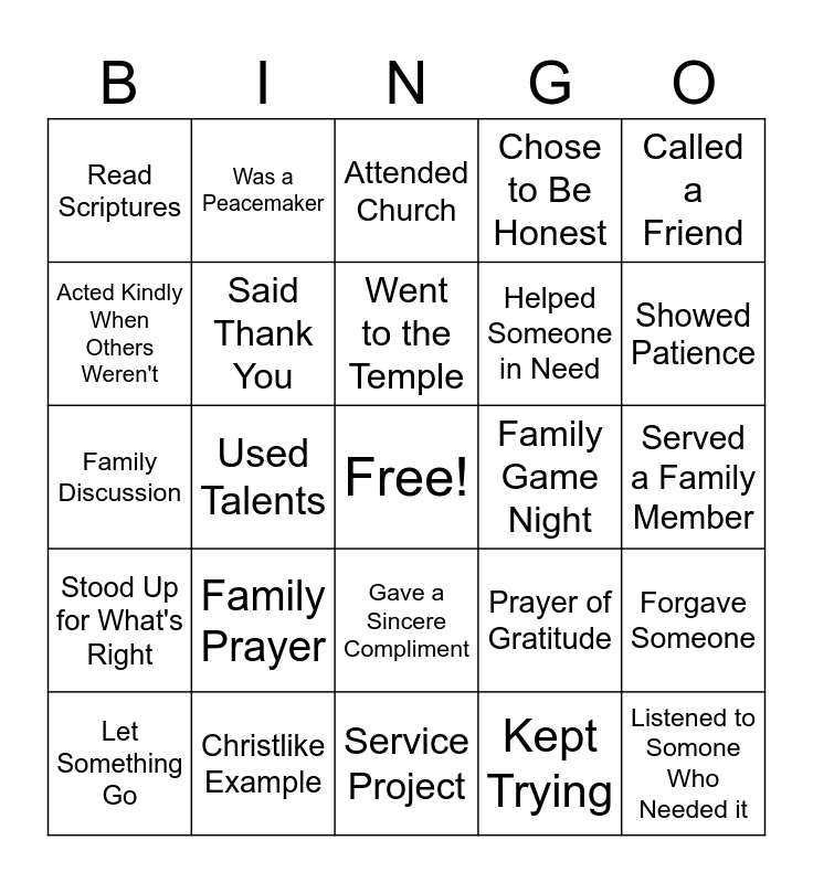 This bingo card has a free space and 26 words: Gave a Sincere Compliment, Kept Trying, Went to the Temple, Christlike Example, Called a Friend, Read Scriptures, Acted Kindly When Others Weren't, Was a Peacemaker, Served a Family Member, Prayer of Gratitude, Helped Someone in Need, Family Discussion, Forgave Someone, Let Something Go, Used Talents, Prayed for Guidance, Chose to Be Honest, Stood Up for What's Right, Attended Church, Listened to Somone Who Needed it, Showed Patience, Service Project, Family Game Night, Family Prayer, Said Thank You and Acted on a Prompting.