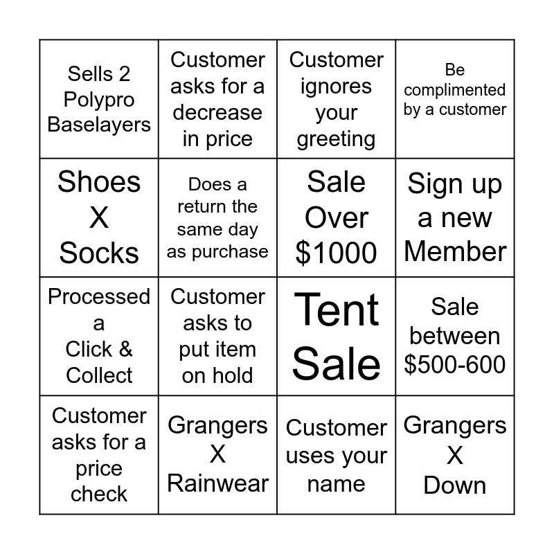 This bingo card has 16 words: Grangers X Rainwear, Sale between $500-600, Customer ignores your greeting, Sells 2 Polypro Baselayers, Processed a Click & Collect, Customer asks for a decrease in price, Tent Sale, Customer uses your name, Shoes X Socks, Does a return the same day as purchase, Customer asks for a price check, Be complimented by a customer, Customer asks to put item on hold, Sign up a new Member, Sale Over $1000 and Grangers X Down.
