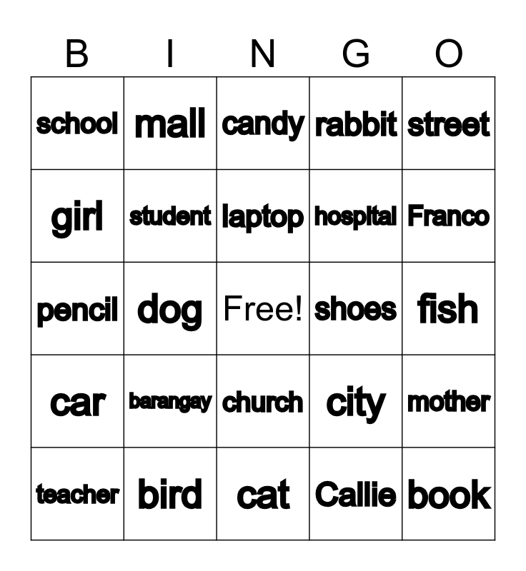 This bingo card has a free space and 29 words: teacher, boy, dog, bag, school, candy, student, barangay, shoes, bird, fish, book, cat, Callie, Franco, cellphone, church, car, street, pencil, city, Emily, hospital, girl, rabbit, mall, mother, laptop and Lenovo.