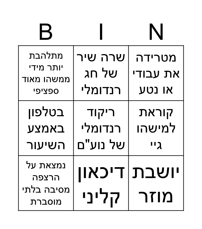 This bingo card has a free space and 8 words: קוראת למישהו גיי, מטרידה את עבודי או נטע, שרה שיר של חג רנדומלי, נמצאת על הרצפה מסיבה בלתי מוסברת, מתלהבת יותר מידי ממשהו מאוד ספציפי, יושבת מוזר, בטלפון באמצע השיעור and דיכאון קליני.