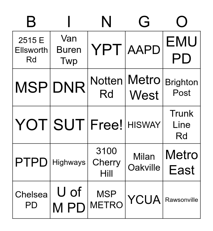 This bingo card has a free space and 24 words: Highways, U of M PD, Notten Rd, Chelsea PD, EMU PD, 2515 E Ellsworth Rd, MSP, Van Buren Twp, HISWAY, 3100 Cherry Hill, Metro West, YOT, Milan Oakville, Metro East, DNR, YCUA, Trunk Line Rd, YPT, Brighton Post, SUT, Rawsonville, PTPD, AAPD and MSP METRO.