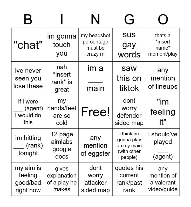 This bingo card has a free space and 24 words: 12 page aimlabs google docs, gives explanation of a play he makes, im a ___ main, my aim is feeling good/bad right now, thats a *insert name* moment/play, "chat", ive never seen you lose these, im gonna touch you, dont worry defender sided map, any mention of eggster, saw this on tiktok, if i were ___ (agent) i would do this, i think im gonna play on my main (with other people), i should've played ___ (agent), nah *insert rank* is great, quotes his current rank/past rank, "im feeling it", my headshot percentage must be crazy rn, any mention of lineups, my hands/feet are so cold, any mention of a valorant video/guide, im hitting ___ (rank) tonight, sus gay words and dont worry attacker sided map.