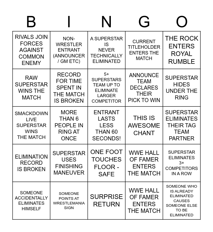 This bingo card has a free space and 27 words: WWE HALL OF FAMER ENTERS THE MATCH, SUPERSTAR ELIMINATES THEIR TAG TEAM PARTNER, ANNOUNCE TEAM DECLARES THEIR PICK TO WIN, SURPRISE RETURN, RAW SUPERSTAR WINS THE MATCH, A SUPERSTAR IS NEVER TECHNICALLY ELIMINATED, NON-WRESTLER ENTRANT (ANNOUNCER / GM ETC), ELIMINATION RECORD IS BROKEN, THIS IS AWESOME CHANT, SUPERSTAR ELIMINATES 3+ COMPETITORS IN A ROW, SMACKDOWN LIVE SUPERSTAR WINS THE MATCH, CURRENT TITLEHOLDER ENTERS THE MATCH, SOMEONE ACCIDENTALLY ELIMINATES HIMSELF, SOMEONE POINTS AT WRESTLEMANIA SIGN, SUPERSTAR HIDES UNDER THE RING, NXT SUPERSTAR COMPETES IN THE MATCH, RECORD FOR TIME SPENT IN THE MATCH IS BROKEN, 5+ SUPERSTARS TEAM UP TO ELIMINATE LARGER COMPETITOR, SUPERSTAR USES FINISHING MANEUVER, RIVALS JOIN FORCES AGAINST COMMON ENEMY, SUPERSTAR ELIMINATES THEIR TAG TEAM PARTNER, WWE HALL OF FAMER ENTERS THE MATCH, MORE THAN 6 PEOPLE IN RING AT ONCE, SOMEONE WHO IS ALREADY ELIMINATED CAUSES SOMEONE ELSE TO BE ELIMINATED, ONE FOOT TOUCHES FLOOR - SAFE, THE ROCK ENTERS ROYAL RUMBLE and CELEBRITY SHOWN IN CROWD.