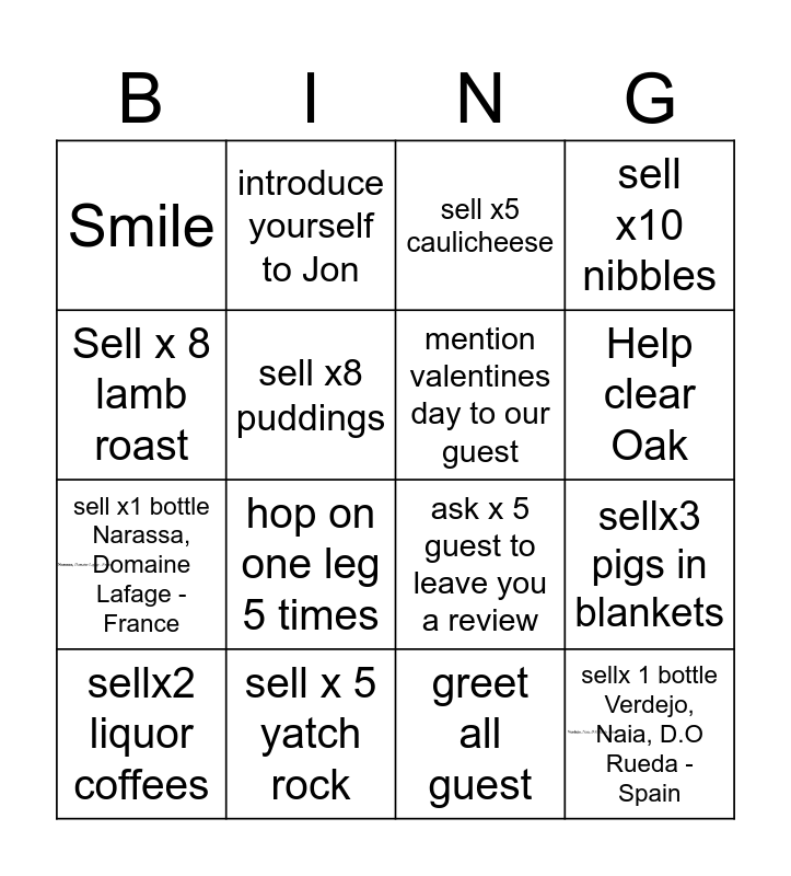 This bingo card has 2 images and 16 words: sell x 5 yatch rock, sellx3 pigs in blankets, sell x5 caulicheese, Smile, sell x1 bottle Narassa, Domaine Lafage - France, introduce yourself to Jon, ask x 5 guest to leave you a review, greet all guest, Sell x 8 lamb roast, sell x8 puddings, sellx2 liquor coffees, sell x10 nibbles, hop on one leg 5 times, Help clear Oak, mention valentines day to our guest and sellx 1 bottle Verdejo, Naia, D.O Rueda - Spain.