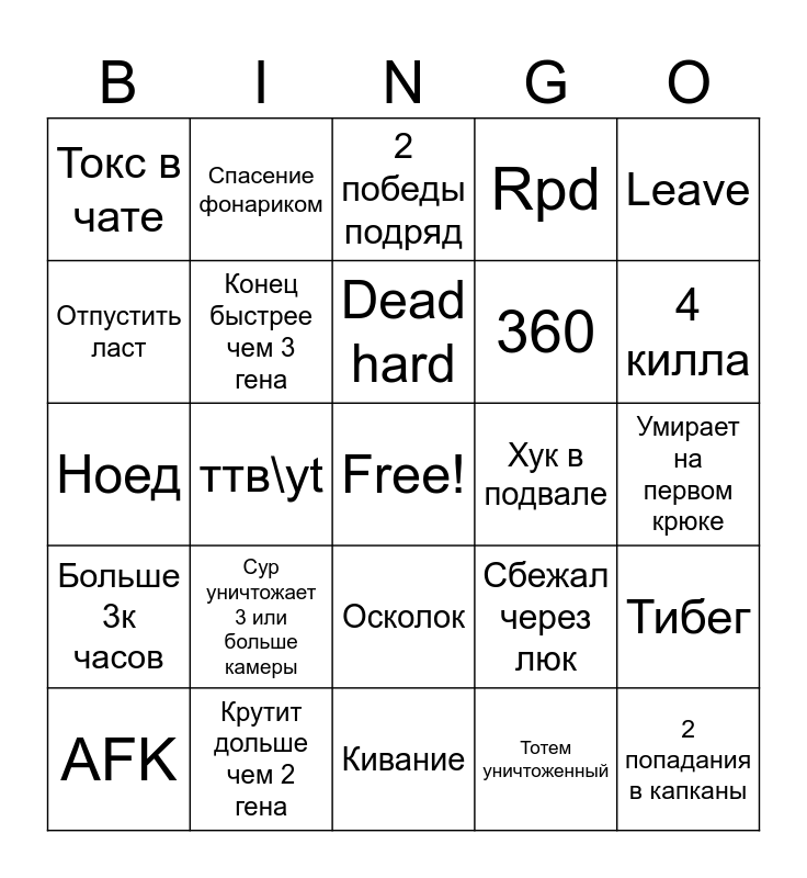 This bingo card has a free space and 24 words: Сур уничтожает 3 или больше камеры, Крутит дольше чем 2 гена, Dead hard, AFK, Leave, Токс в чате, Отпустить ласт, Спасение фонариком, Хук в подвале, Осколок, 360, Ноед, Сбежал через люк, Тибег, Конец быстрее чем 3 гена, Тотем уничтоженный, Умирает на первом крюке, 2 победы подряд, 4 килла, ттв\yt, 2 попадания в капканы, Больше 3к часов, Rpd and Кивание.