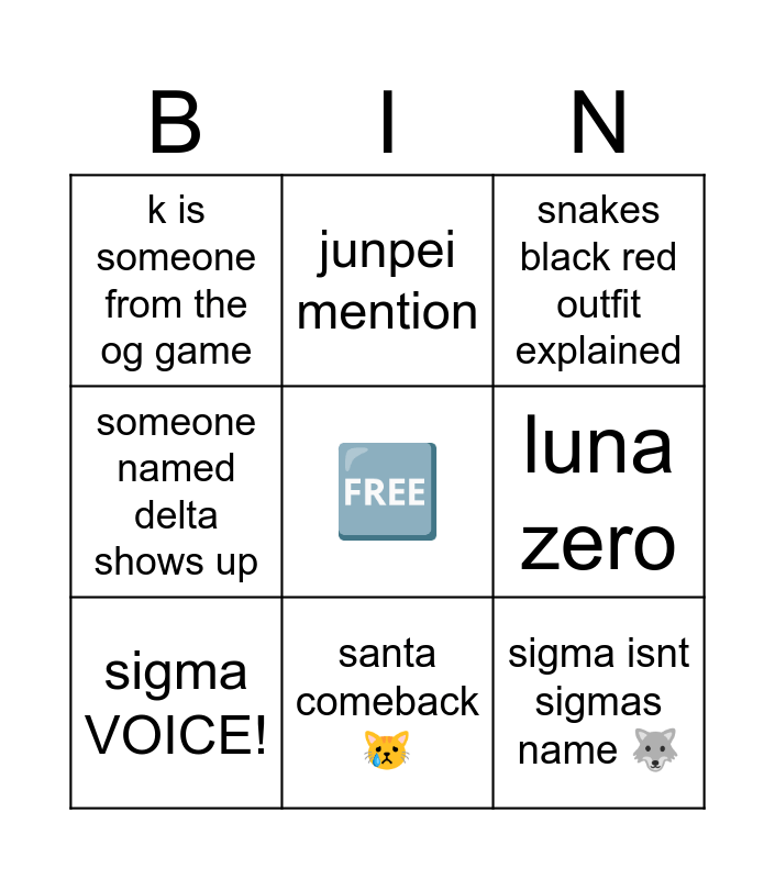 This bingo card has a free space and 8 words: luna zero, snakes black red outfit explained, junpei mention, sigma VOICE!, k is someone from the og game, sigma isnt sigmas name 🐺, someone named delta shows up and santa comeback 😿.