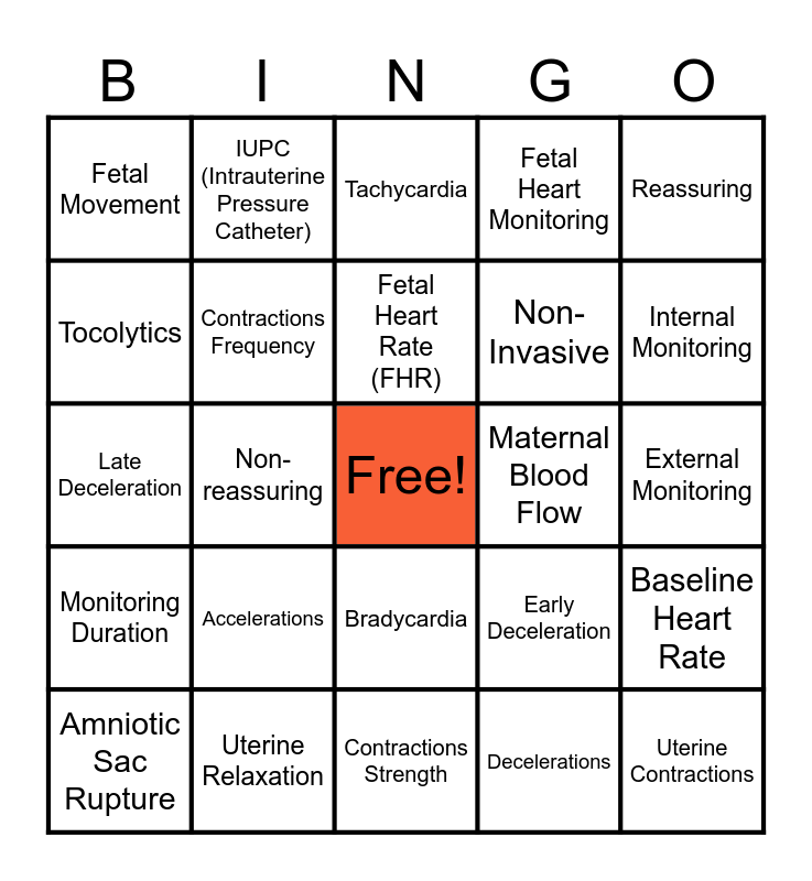 This bingo card has a free space and 42 words: Cardiotocography (CTG), Fetal Heart Rate (FHR), Variability, Accelerations, Decelerations, Baseline Heart Rate, Uterine Contractions, Fetal Distress, Tachycardia, Bradycardia, External Monitoring, Internal Monitoring, Non-reassuring, Reassuring, Prolonged Deceleration, Early Deceleration, Variable Deceleration, Late Deceleration, Sinusoidal, IUPC (Intrauterine Pressure Catheter), Tocolytics, Ultrasound, Fetal Scalp Electrode, Fetal Movement, Maternal Position, High-Risk Pregnancy, Non-Invasive, Pre-eclampsia, IUGR (Intrauterine Growth Restriction), Fetal Hypoxia, Acidosis, Monitoring Duration, Contractions Frequency, Contractions Strength, FHR Monitoring, Amniotic Sac Rupture, Uterine Relaxation, Maternal Blood Flow, Sleep Periods, Accelerations Absence, Fetal Heart Monitoring and Maternal Comfort.