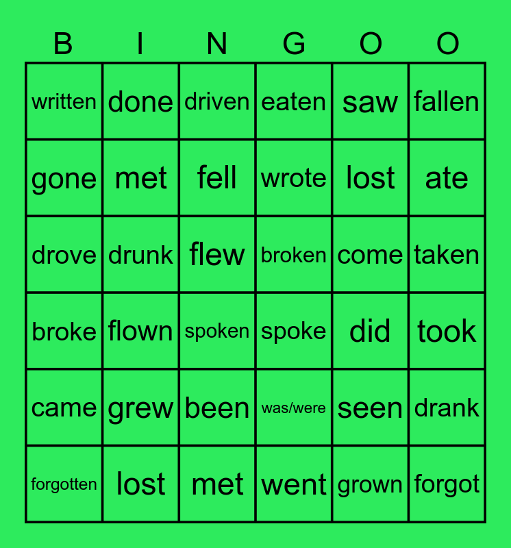 This bingo card has 36 words: was/were, been, went, gone, broke, broken, met, met, saw, seen, ate, eaten, drank, drunk, wrote, written, came, come, drove, driven, flew, flown, spoke, spoken, did, done, lost, lost, fell, fallen, forgot, forgotten, took, taken, grew and grown.