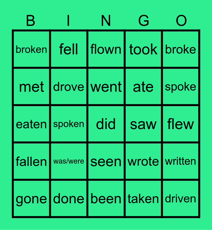This bingo card has 25 words: was/were, been, went, gone, broke, broken, met, fell, saw, seen, ate, eaten, wrote, written, drove, driven, flew, flown, spoke, spoken, did, done, fallen, took and taken.