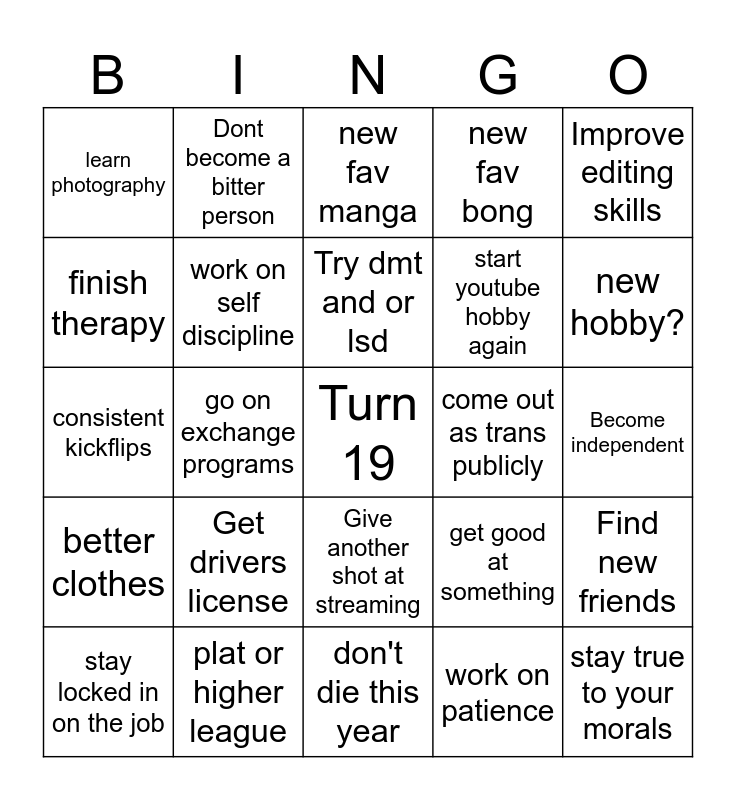 This bingo card has a free space and 24 words: Get drivers license, plat or higher league, Try dmt and or lsd, stay locked in on the job, Improve editing skills, learn photography, finish therapy, Dont become a bitter person, come out as trans publicly, Give another shot at streaming, start youtube hobby again, consistent kickflips, get good at something, Find new friends, work on self discipline, work on patience, Become independent, new fav manga, new hobby?, go on exchange programs, stay true to your morals, better clothes, new fav bong and don't die this year.