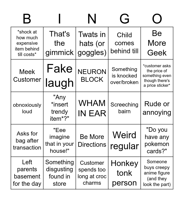 This bingo card has a free space and 24 words: "Eee imagine that in your house!", Something disgusting found in store, NEURON BLOCK, Left parents basement for the day, Be More Geek, *shock at how much expensive item behind till costs*, Meek Customer, That's the gimmick, Screeching bairn, Be More Directions, Something is knocked over/broken, obnoxiously loud, Weird regular, "Do you have any pokemon cards?", Fake laugh, Honkey tonk person, Rude or annoying, Twats in hats (or goggles), *customer asks the price of something even though there's a price sticker*, "Any *insert trendy item*?", Someone buys creepy anime figure (and they look the part), Asks for bag after transaction, Child comes behind till and Customer spends too long at croc charms.