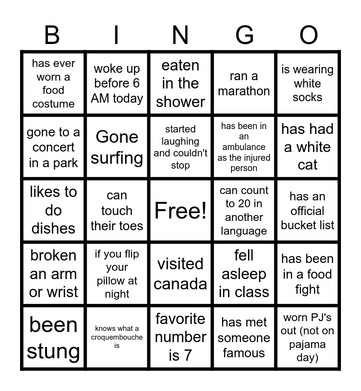 This bingo card has a free space and 39 words: Played tennis, speak two or more languages, seen the parade in NYC, Gone surfing, been stung, visited canada, started laughing and couldn't stop, Seen the ball drop (in person), is wearing white socks, broken an arm or wrist, can touch their toes, ran a marathon, worn PJ's out (not on pajama day), has an official bucket list, can count to 20 in another language, if you flip your pillow at night, has gotten stuck in the blankets., has ever worn a food costume, likes sauerkraut, fell asleep in class, gone to a concert in a park, favorite number is 7, has been in an ambulance as the injured person, has had a white cat, Told a really bad joke, Sneezed 6 times in a row, built a hot wheels track through the house, played bingo (not this one), has been on a train, woke up before 6 AM today, has had food dumped on their head, has walked to school, eaten in the shower, knows what a croquembouche is, has met someone famous, has baked cookie brownies, has been in a food fight, likes to do dishes and has gotten to level 50 in a game.