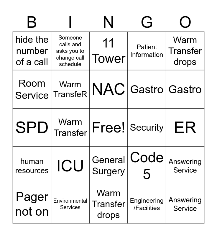 This bingo card has a free space and 42 words: OB Triage, NAC, Overhead Page, ICU, Engineering /Facilities, Answering Service, Answering Service, Infusion Center, 11 Tower, General Surgery, ER, Gastro, Warm Transfer, Warm Transfer drops, Interventional Radiology, Code 5, Medical Records, SPD, Nephrology, Someone calls and asks you to change call schedule, Room Service, security, language line, hide the number of a call, General Surgery, ER, Gastro, Shares too much info, Dial a number out, After Hours Clinic, Patient Lookup and Not Here, human resources, Warm TransfeR, Warm Transfer drops, Language Line, Pager not on, Environmental Services, Security, Nephrology, Infectious Disease, Patient Information and Elevator Call.