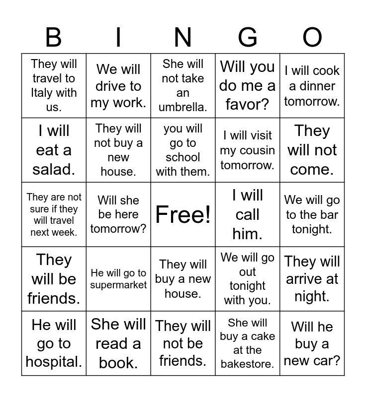 This bingo card has a free space and 24 words: He will go to supermarket, She will read a book., you will go to school with them., He will go to hospital., I will cook a dinner tomorrow., They will travel to Italy with us., I will eat a salad., We will drive to my work., I will call him., They will buy a new house., I will visit my cousin tomorrow., They are not sure if they will travel next week., We will go out tonight with you., They will arrive at night., They will not buy a new house., She will buy a cake at the bakestore., We will go to the bar tonight., She will not take an umbrella., They will not come., Will she be here tomorrow?, Will he buy a new car?, They will be friends., Will you do me a favor? and They will not be friends..