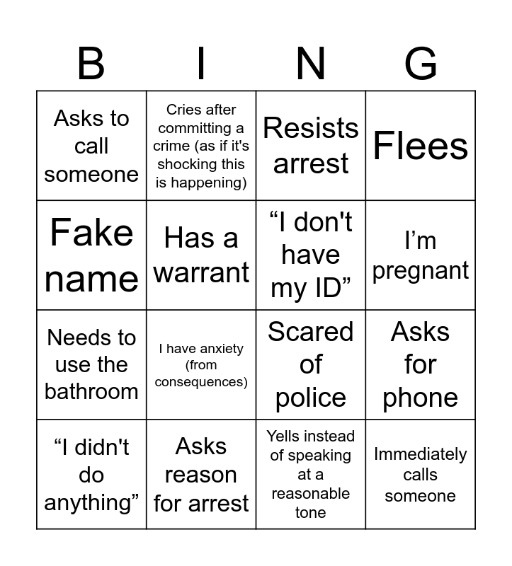 This bingo card has 23 words: “I didn't do anything”, “I have to pick up my kids”, “I don't have my ID”, Immediately calls someone, Asks to call someone, Cries after committing a crime (as if it's shocking this is happening), Resists arrest, Flees, Needs to use the bathroom, Asks reason for arrest, Scared of police, Asks for phone, Has a criminal record, Won't provide name, Won't shut up, Brings up a lawyer, Has a warrant, Yells instead of speaking at a reasonable tone, I’m pregnant, Fake name, I have anxiety (from consequences), I'm tired and bro bro bro.