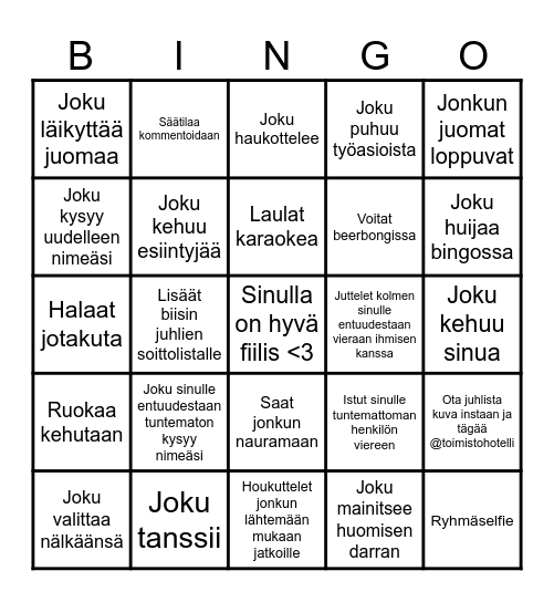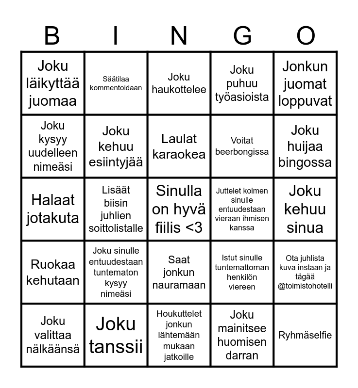 This bingo card has a free space and 24 words: Joku sinulle entuudestaan tuntematon kysyy nimeäsi, Joku tanssii, Laulat karaokea, Joku valittaa nälkäänsä, Jonkun juomat loppuvat, Joku läikyttää juomaa, Joku kysyy uudelleen nimeäsi, Säätilaa kommentoidaan, Juttelet kolmen sinulle entuudestaan vieraan ihmisen kanssa, Saat jonkun nauramaan, Voitat beerbongissa, Halaat jotakuta, Istut sinulle tuntemattoman henkilön viereen, Ota juhlista kuva instaan ja tägää @toimistohotelli, Joku kehuu esiintyjää, Joku mainitsee huomisen darran, Joku kehuu sinua, Joku haukottelee, Joku huijaa bingossa, Lisäät biisin juhlien soittolistalle, Ryhmäselfie, Ruokaa kehutaan, Joku puhuu työasioista and Houkuttelet jonkun lähtemään mukaan jatkoille.