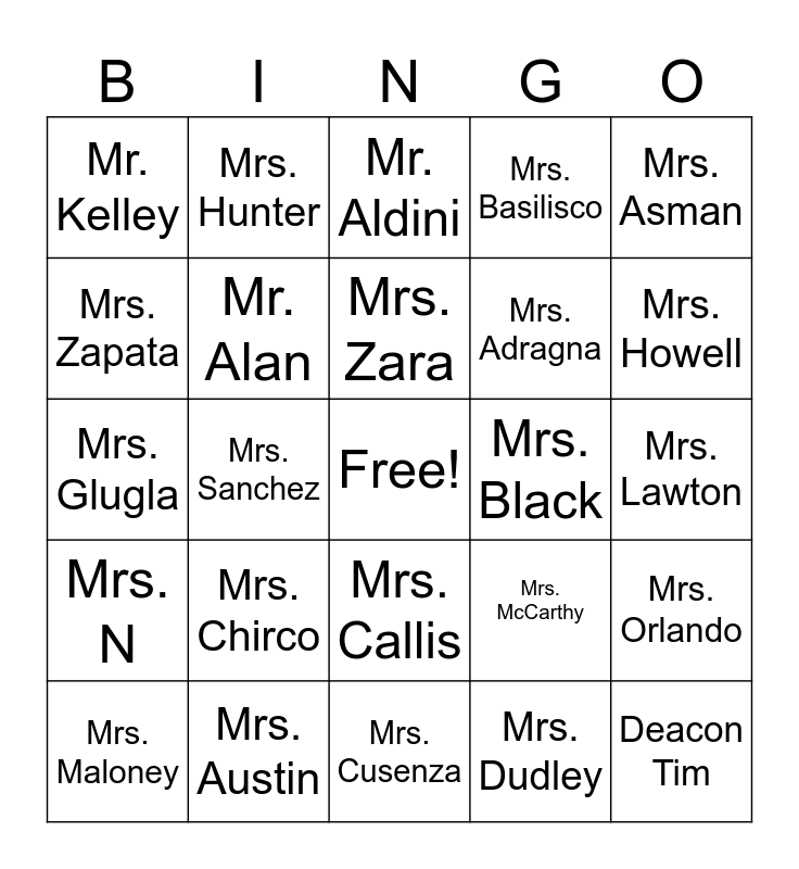 This bingo card has a free space and 44 words: Ms. Karwoski, Deacon Tim, Mrs. Rupkus, Mrs. Maloney, Mrs. Shafer, Mrs. Dudley, Mr. Aldini, Ms. Alongi, Mrs. Asman, Mrs. Austin, Mrs. Basilisco, Mrs. Black, Mrs. Callis, Mrs. Chirco, Ms. Collamar, Mrs. Cusenza, Mrs. Duncan, Mrs. Glugla, Mrs. Grosu, Mrs. Howell, Mrs. Hunter, Mrs. Jankowski, Mr. Kalpin, Mr. Kelley, Mrs. LaPrise, Mrs. Lawton, Miss Jeanette, Mr. Masters, Mrs. McCarthy, Mrs. N, Miss N, Mrs. Orlando, Mrs. Pope, Mrs. Ray, Mrs. Sanchez, Ms. Spatafora, Ms. Kramer, Mrs. Vecchiarelli, Mrs. Zara, Mrs. Zapata, Mrs. Adragna, Mrs. Jansen, Mr. Alan and Father Kevin.