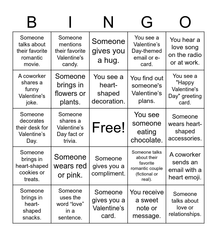 This bingo card has a free space and 25 words: Someone wears red or pink., Someone gives you a Valentine’s card., You see a heart-shaped decoration., Someone brings in heart-shaped snacks., You hear a love song on the radio or at work., Someone talks about their favorite romantic movie., A coworker shares a funny Valentine's joke., Someone mentions their favorite Valentine's candy., You see someone eating chocolate., Someone gives you a compliment., You find out someone's Valentine’s plans., Someone decorates their desk for Valentine’s Day., Someone talks about their favorite romantic couple (fictional or real)., A coworker sends an email with a heart emoji., Someone brings in flowers or plants., A coworker tells you a funny Valentine's Day memory., Someone wears heart-shaped accessories., Someone gives you a hug., You see a "Happy Valentine's Day" greeting card., Someone shares a Valentine’s Day fact or trivia., Someone talks about love or relationships., Someone uses the word “love” in a sentence., Someone brings in heart-shaped cookies or treats., You see a Valentine’s Day-themed email or e-card. and You receive a sweet note or message..