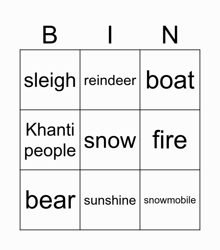 This bingo card has a free space and 8 words: fire, boat, reindeer, bear, sleigh, snowmobile, Khanti people and sunshine.