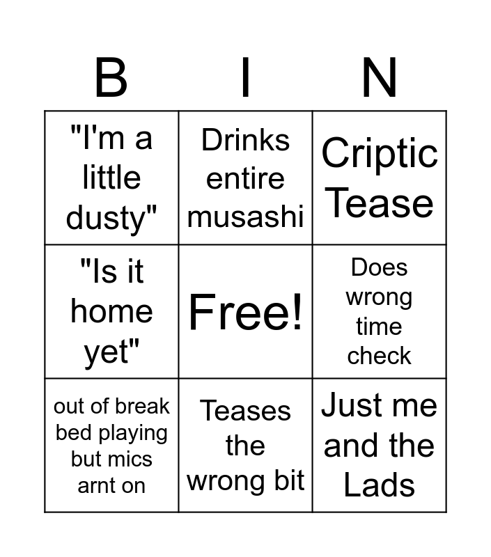 This bingo card has a free space and 8 words: Does wrong time check, Criptic Tease, Drinks entire musashi, out of break bed playing but mics arnt on, "I'm a little dusty", Just me and the Lads, "Is it home yet" and Teases the wrong bit.