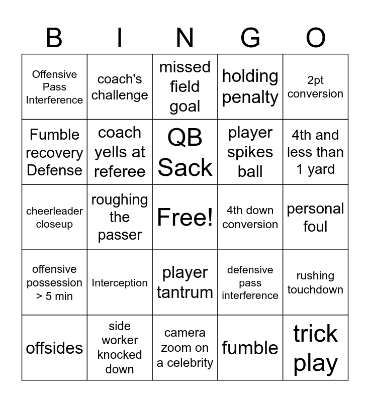 This bingo card has a free space and 24 words: Interception, side worker knocked down, QB Sack, offsides, 2pt conversion, Offensive Pass Interference, Fumble recovery Defense, coach's challenge, 4th down conversion, player tantrum, player spikes ball, cheerleader closeup, defensive pass interference, rushing touchdown, coach yells at referee, fumble, personal foul, missed field goal, 4th and less than 1 yard, roughing the passer, trick play, offensive possession > 5 min, holding penalty and camera zoom on a celebrity.