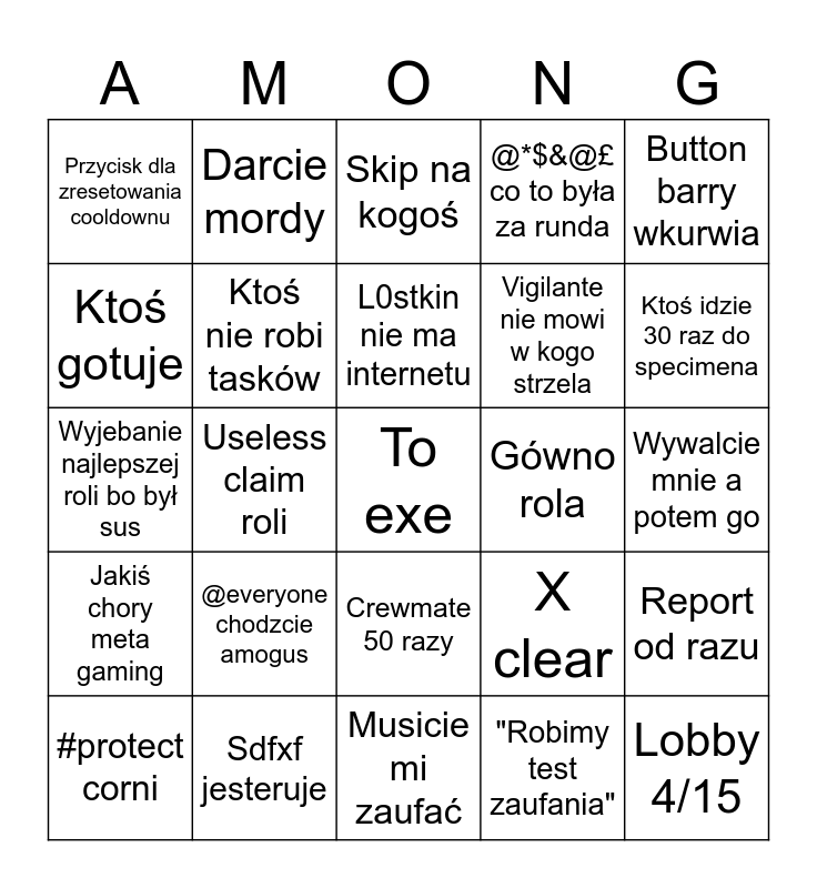 This bingo card has a free space and 24 words: @everyone chodzcie amogus, Sdfxf jesteruje, L0stkin nie ma internetu, #protect corni, Button barry wkurwia, Przycisk dla zresetowania cooldownu, Ktoś gotuje, Darcie mordy, Gówno rola, Crewmate 50 razy, Vigilante nie mowi w kogo strzela, Wyjebanie najlepszej roli bo był sus, X clear, Report od razu, Ktoś nie robi tasków, "Robimy test zaufania", Wywalcie mnie a potem go, Skip na kogoś, Ktoś idzie 30 raz do specimena, Useless claim roli, Lobby 4/15, Jakiś chory meta gaming, @*$&@£ co to była za runda and Musicie mi zaufać.