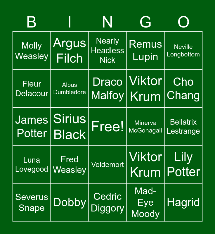 This bingo card has a free space and 39 words: Harry Potter, Hermione Granger, Ron Weasley, Albus Dumbledore, Severus Snape, Voldemort, Draco Malfoy, Ginny Weasley, Neville Longbottom, Luna Lovegood, Sirius Black, Remus Lupin, Hagrid, Bellatrix Lestrange, Minerva McGonagall, Fred Weasley, George Weasley, Molly Weasley, Arthur Weasley, Viktor Krum, Fleur Delacour, Cedric Diggory, Viktor Krum, Cho Chang, Dolores Umbridge, Nymphadora Tonks, Lucius Malfoy, Narcissa Malfoy, Peter Pettigrew, Argus Filch, Gilderoy Lockhart, Moaning Myrtle, Nearly Headless Nick, Dobby, Mad-Eye Moody, Oliver Wood, Lily Potter, James Potter and Lavender Brown.