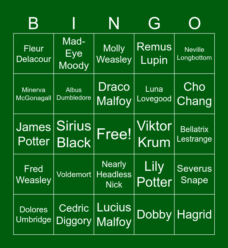 This bingo card has a free space and 38 words: Harry Potter, Hermione Granger, Ron Weasley, Albus Dumbledore, Severus Snape, Voldemort, Draco Malfoy, Ginny Weasley, Neville Longbottom, Luna Lovegood, Sirius Black, Remus Lupin, Hagrid, Bellatrix Lestrange, Minerva McGonagall, Fred Weasley, George Weasley, Molly Weasley, Arthur Weasley, Viktor Krum, Fleur Delacour, Cedric Diggory, Cho Chang, Dolores Umbridge, Nymphadora Tonks, Lucius Malfoy, Narcissa Malfoy, Peter Pettigrew, Argus Filch, Gilderoy Lockhart, Moaning Myrtle, Nearly Headless Nick, Dobby, Mad-Eye Moody, Oliver Wood, Lily Potter, James Potter and Lavender Brown.