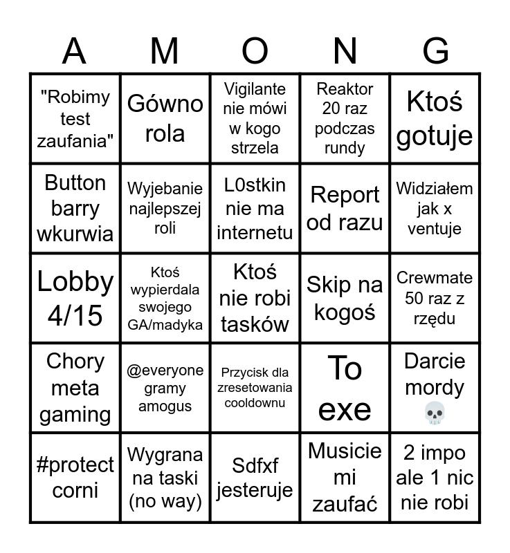 This bingo card has 25 words: @everyone gramy amogus, Sdfxf jesteruje, L0stkin nie ma internetu, #protect corni, Ktoś gotuje, "Robimy test zaufania", Button barry wkurwia, Gówno rola, Skip na kogoś, Przycisk dla zresetowania cooldownu, Report od razu, Lobby 4/15, To exe, Darcie mordy 💀, Wyjebanie najlepszej roli, 2 impo ale 1 nic nie robi, Crewmate 50 raz z rzędu, Vigilante nie mówi w kogo strzela, Widziałem jak x ventuje, Ktoś wypierdala swojego GA/madyka, Ktoś nie robi tasków, Wygrana na taski (no way), Chory meta gaming, Reaktor 20 raz podczas rundy and Musicie mi zaufać.