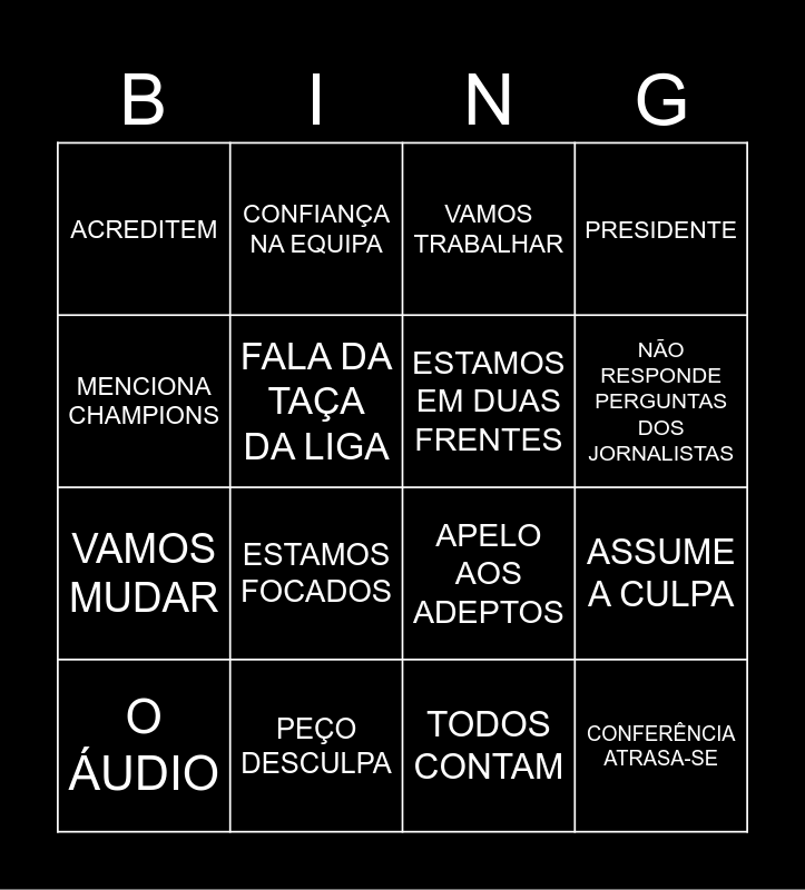 This bingo card has 16 words: PEÇO DESCULPA, ASSUME A CULPA, VAMOS TRABALHAR, ACREDITEM, VAMOS MUDAR, CONFIANÇA NA EQUIPA, APELO AOS ADEPTOS, TODOS CONTAM, MENCIONA CHAMPIONS, FALA DA TAÇA DA LIGA, O ÁUDIO, PRESIDENTE, ESTAMOS FOCADOS, NÃO RESPONDE PERGUNTAS DOS JORNALISTAS, ESTAMOS EM DUAS FRENTES and CONFERÊNCIA ATRASA-SE.