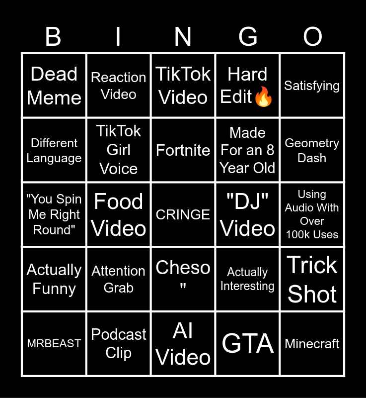 This bingo card has a free space and 24 words: MRBEAST, Attention Grab, Fortnite, GTA, Satisfying, Dead Meme, Reaction Video, TikTok Video, "DJ" Video, Using Audio With Over 100k Uses, "You Spin Me Right Round", TikTok Girl Voice, Actually Interesting, Trick Shot, Different Language, Podcast Clip, AI Video, Hard Edit🔥, Geometry Dash, Actually Funny, Food Video, Cheso ", Made For an 8 Year Old and Minecraft.