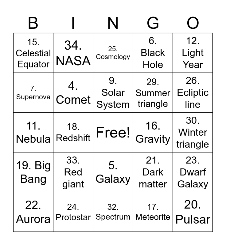 This bingo card has a free space and 35 words: 1. Star, 2. Planet, 3. Asteroid, 4. Comet, 5. Galaxy, 6. Black Hole, 7. Supernova, 8. Exoplanet, 9. Solar System, 10. Universe, 11. Nebula, 12. Light Year, 13. Orbit, 14. Telescope, 15. Celestial Equator, 16. Gravity, 17. Meteorite, 18. Redshift, 19. Big Bang, 20. Pulsar, 21. Dark matter, 22. Aurora, 23. Dwarf Galaxy, 24. Protostar, 25. Cosmology, 26. Ecliptic line, 27. Albedo, 28. Sirius, 29. Summer triangle, 30. Winter triangle, 31. Magnetic Field, 32. Spectrum, 33. Red giant, 34. NASA and 35. NARIT.