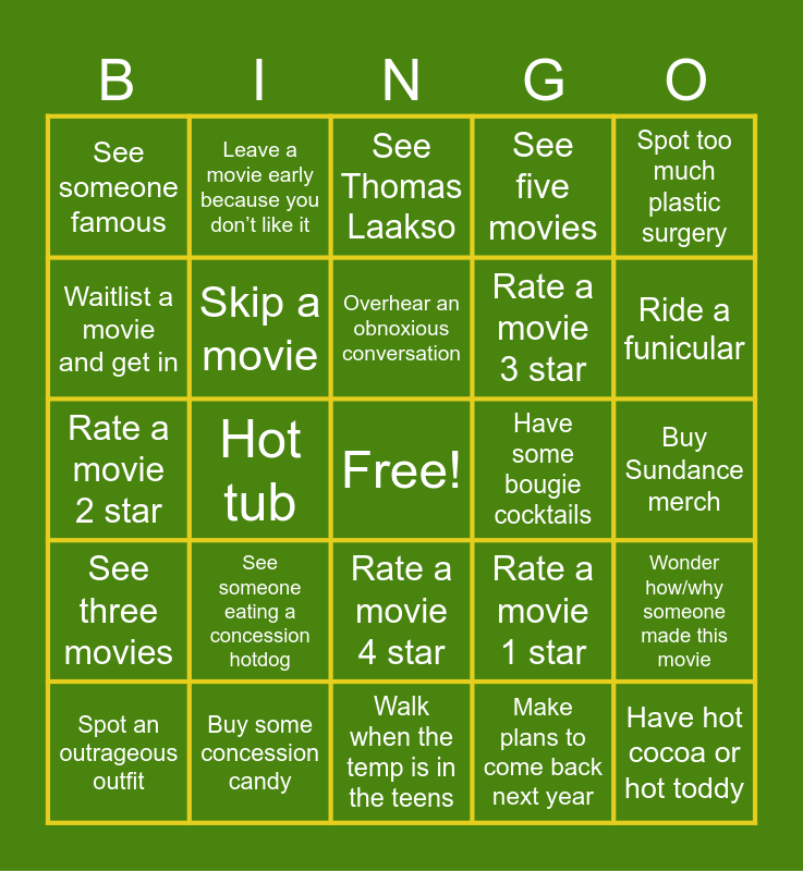 This bingo card has a free space and 24 words: See someone eating a concession hotdog, Buy some concession candy, Overhear an obnoxious conversation, Spot an outrageous outfit, Spot too much plastic surgery, See someone famous, Waitlist a movie and get in, Leave a movie early because you don’t like it, Have some bougie cocktails, Rate a movie 4 star, Rate a movie 3 star, Rate a movie 2 star, Rate a movie 1 star, Wonder how/why someone made this movie, Skip a movie, Make plans to come back next year, Buy Sundance merch, See Thomas Laakso, Ride a funicular, Hot tub, Have hot cocoa or hot toddy, See three movies, See five movies and Walk when the temp is in the teens.